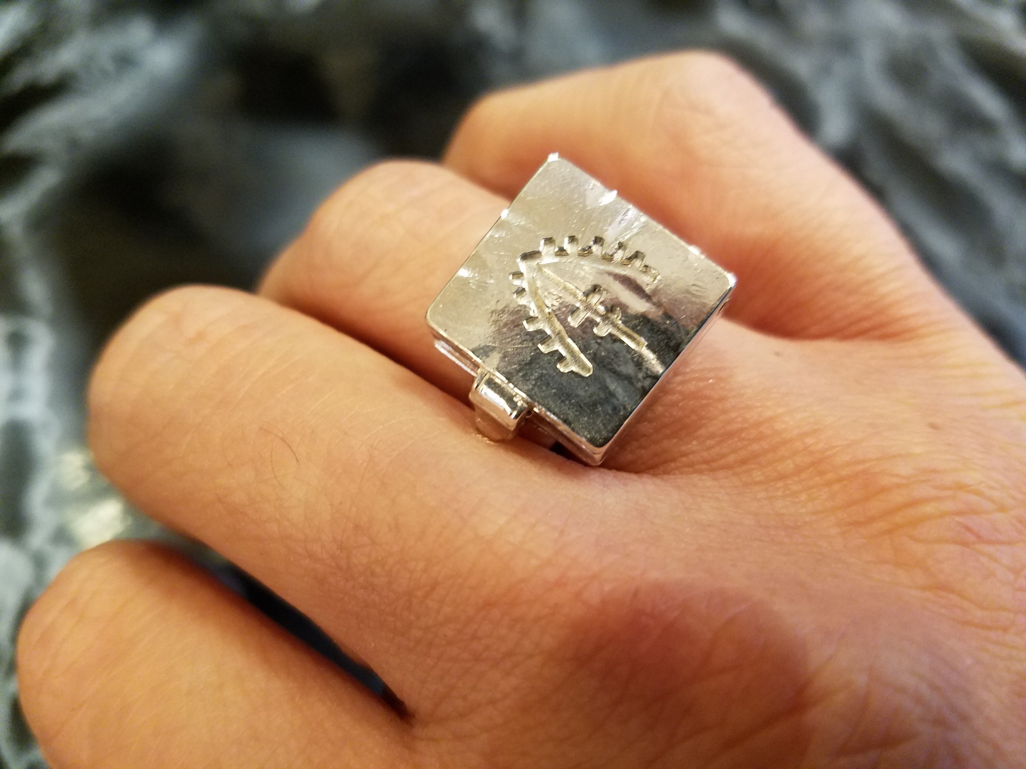サマセット・モームの本の表紙に記されているマサイ族の魔除けのマークをデザインし指輪全体を本のようにデザインしました。
