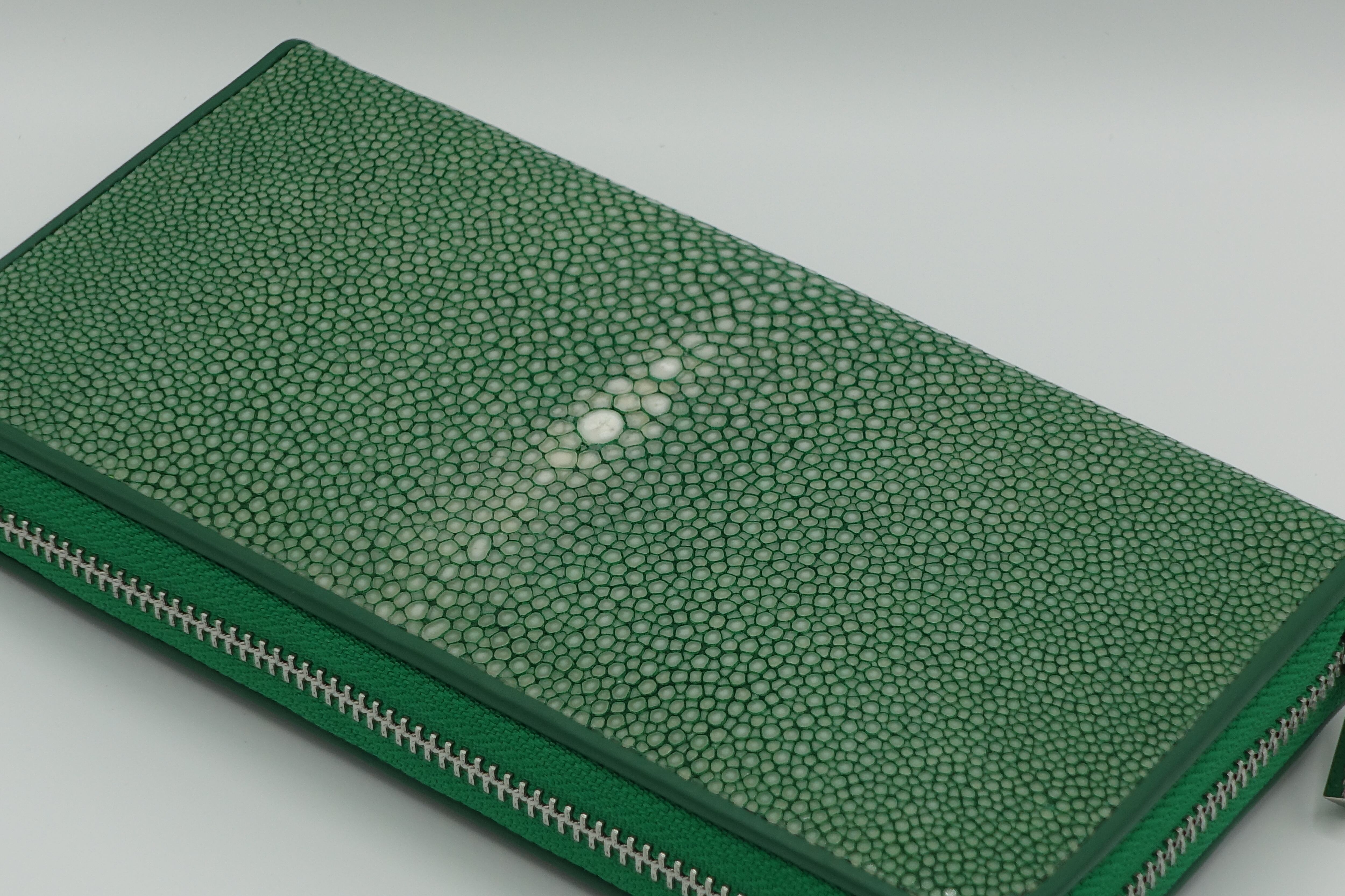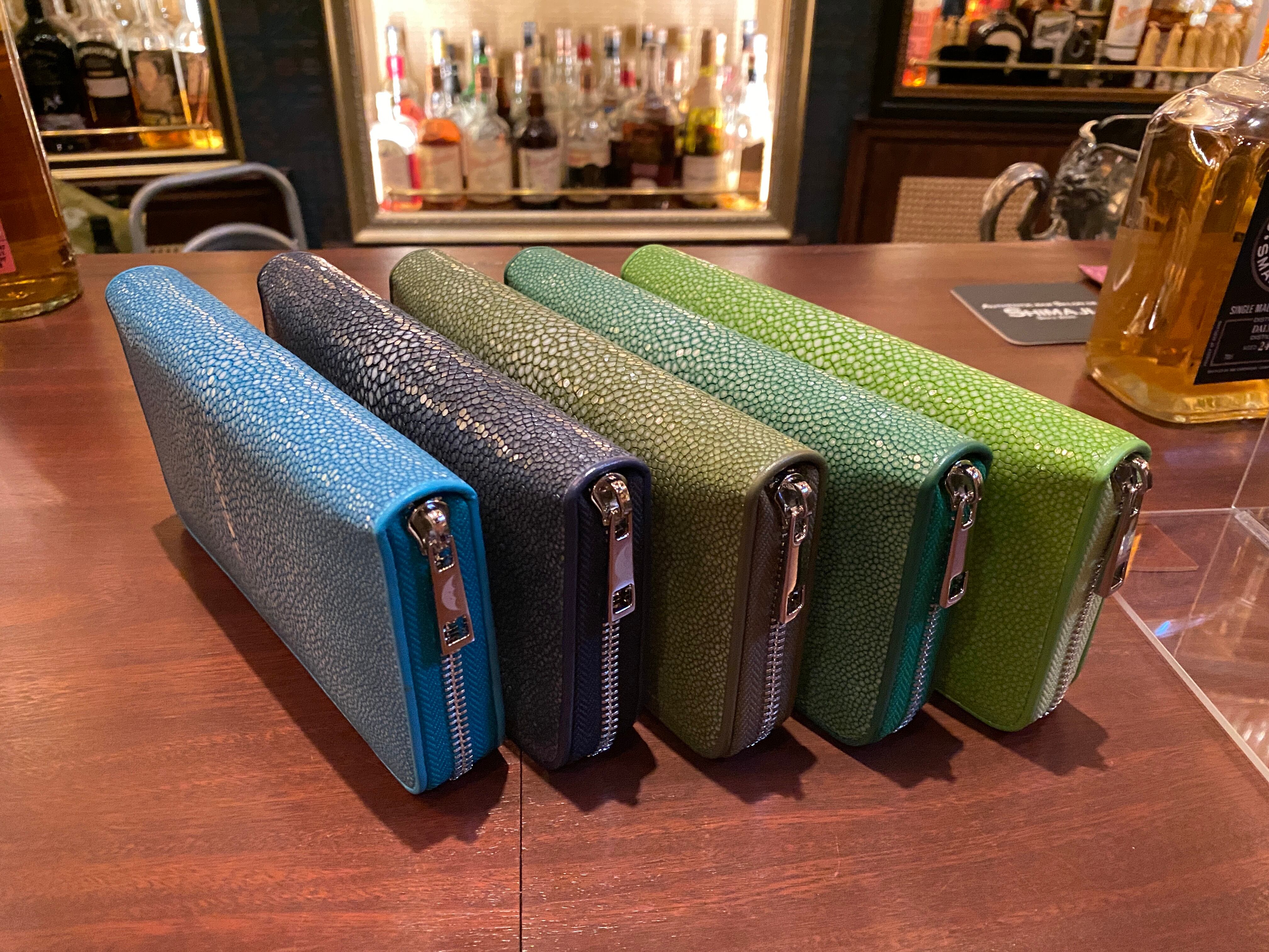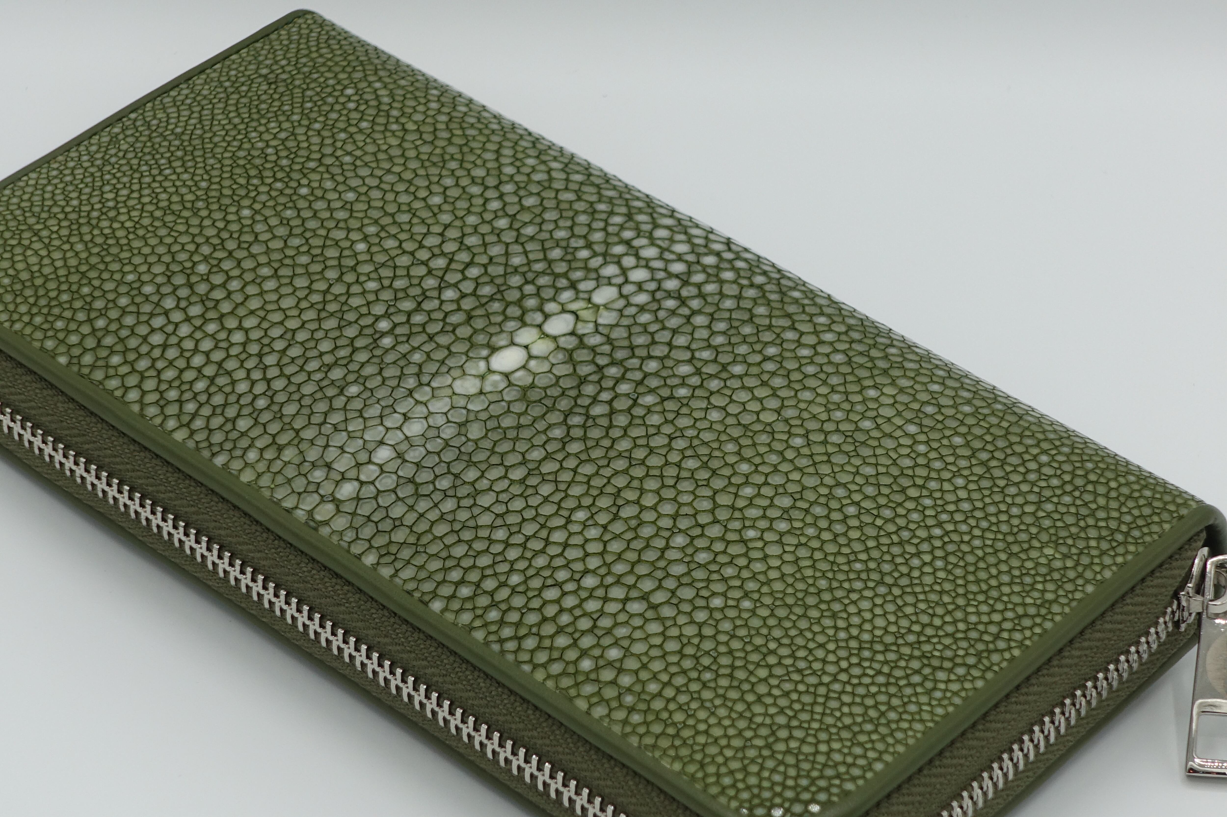 ガルーシャ(アカエイ:英名スティングレー)は昔から、『海の宝石』と呼ばれて高級皮革素材として珍重されています。 非常に硬くて光沢感があり、まるでガラスビーズを一面に敷き詰めたような細かい突起が特徴的な革です。 主な主成分は、人間の歯と同じ『リン酸カルシウム』なので、磨けば磨くほど光沢感が増す性質を持っています。 また、エイの『背中の中心部分』には、鋭く突起した箇所があり、ここを『第三の目』や『スターマーク』と呼んでおります(刀の世界では親粒と呼ぶ)。このスターマークは、エイ革一匹に一箇所しかなく、製品に加工する際はこの部分を目立たせるデザインが人気です。